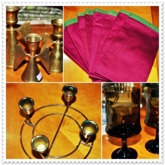 | Above: 3 brass angels for $3.99, Martha Stewart table napkin 4pcs for $2.99 Below: I took this right away for this will be my Advent wreath/candle holder $2.99, steamed glass 8 pcs for .56 cents |